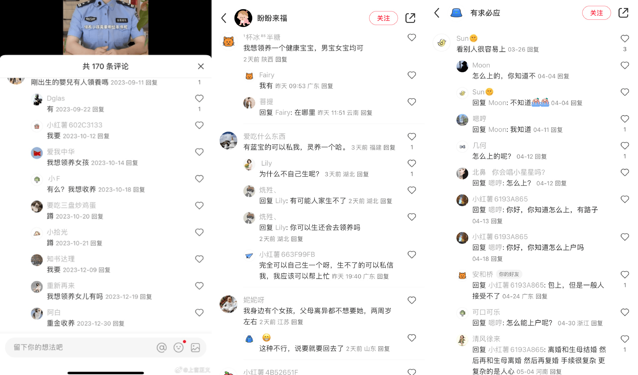 上官正義稱,甚至有胎兒還在腹中,就已經在小紅書平台公開預訂“送養”,這些送養,實為明碼實價的金錢交易。他們以公開發帖、開設話題、評論等方式發佈信息,有的在普法類的文章下從事違法信息的發佈,其中也有打着領養送養及販賣出生證的旗號,實施詐騙。