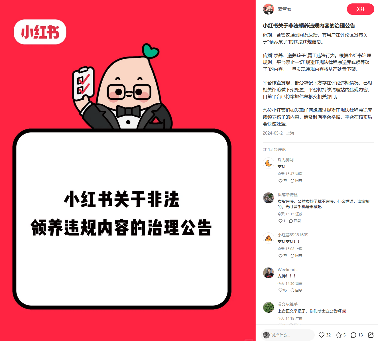 21日,小紅書就該平台“有人領養送養孩子”事件發表公告稱: