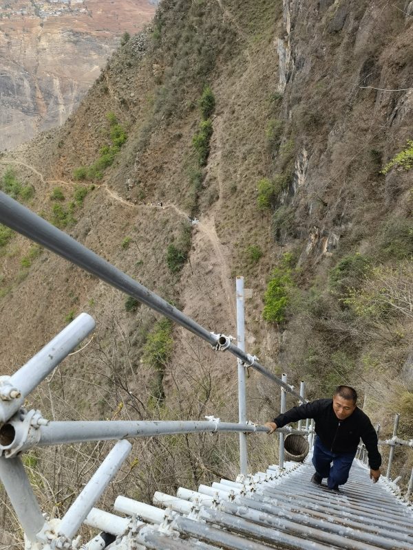 懸崖村因脱貧攻堅而廣受關注,外地許多人自發到這裏攀登鋼梯。鋼梯剛開始倒還平緩,翻上幾個拐彎後,就陡峭起來,而且越來越險。鋼梯之上,一個個身影縮為小點,身子懸空,只敢手腳並用,緊緊拽住鋼梯,向上攀去。