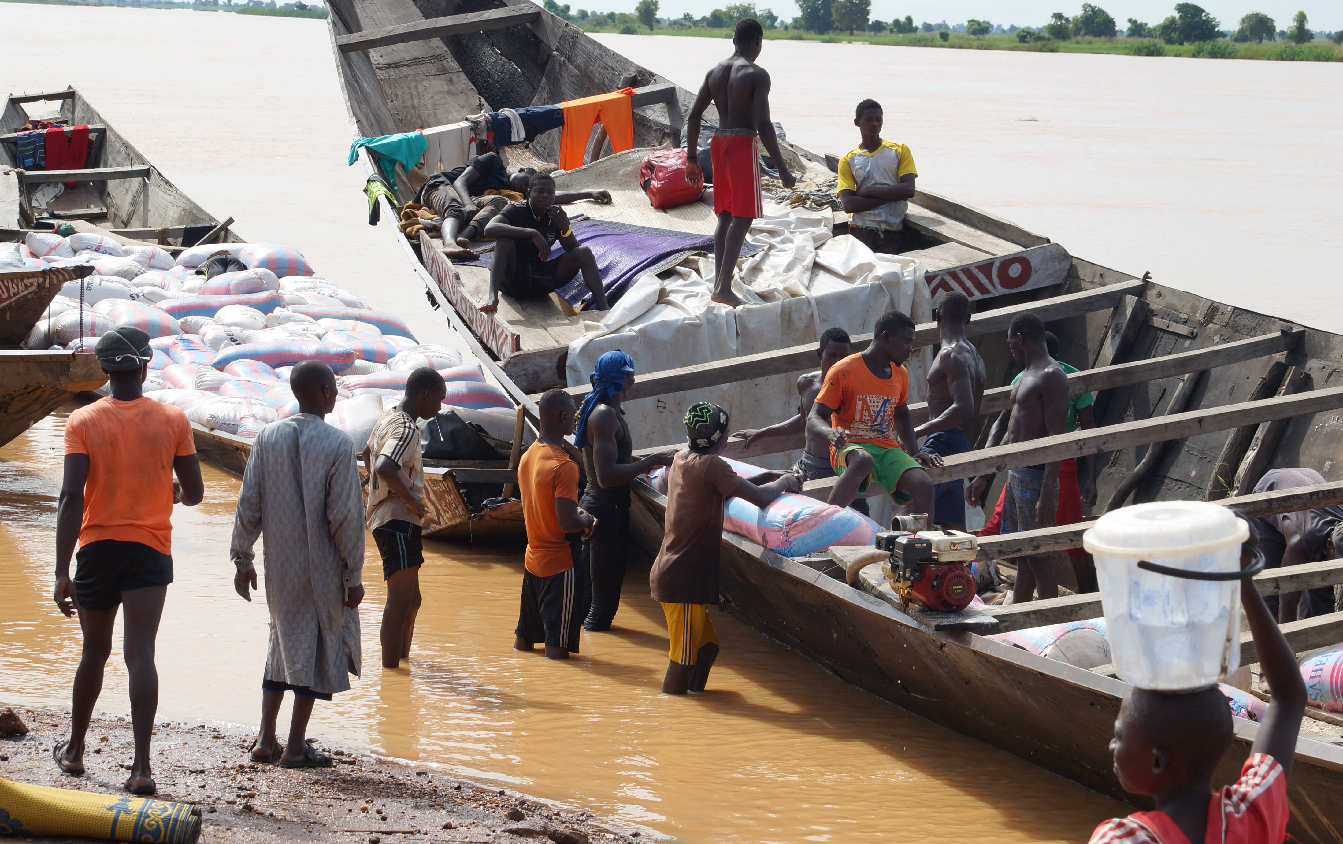 當地時間2023年9月9日,尼日爾加亞,民眾將來自貝寧的貨物從船上卸下放在尼日爾河岸邊,然後用卡車運往各個城市。 圖源:視覺中國