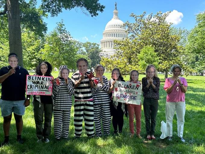 聽證會開始前,抗議者在國會前指控布林肯“戰犯”。圖自“粉紅準則”社交媒體賬號