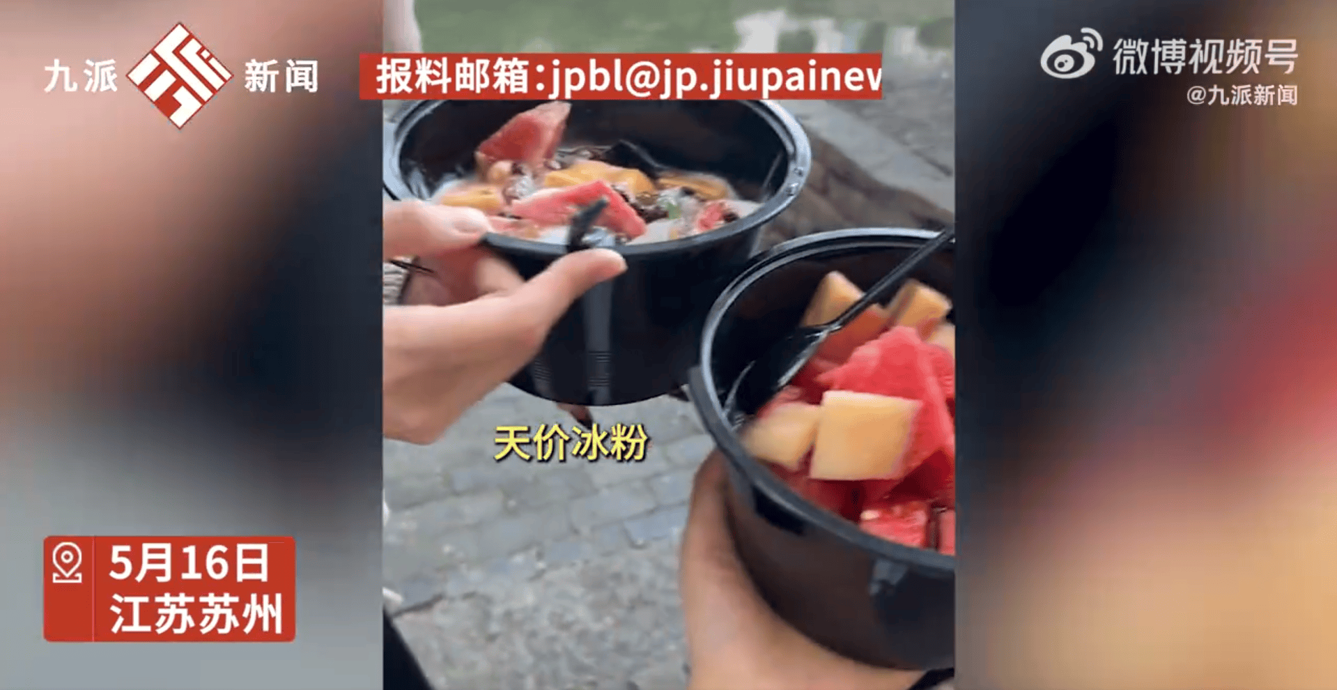 據九派新聞此前報道,5月16日,有網友發視頻稱在崑山市周莊古鎮景區購買了兩碗冰粉,花費150元。該網友在評論區稱,該店鋪以克重標價,自選稱重後是179元,講價後付款150元。