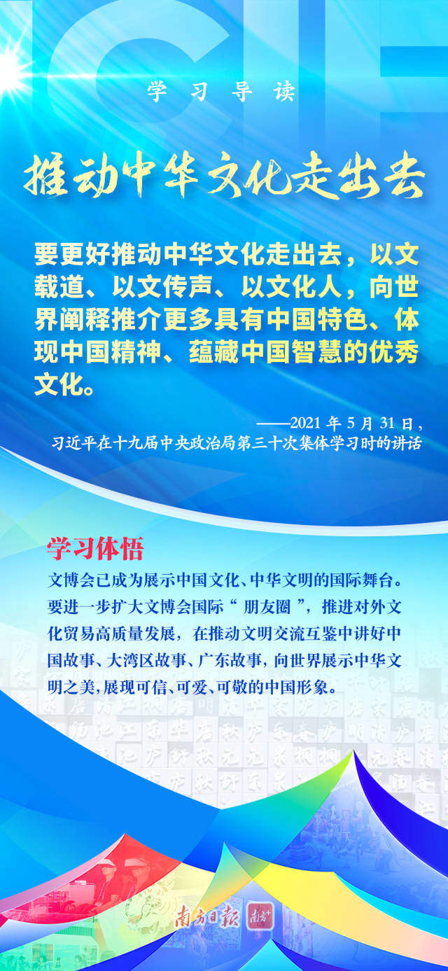 今年的文博會,深入踐行習近平文化思想,肩負新的文化使命繼續揚帆遠航。讓我們透過文博會這扇窗,深刻感悟習近平文化思想的博大精深,深刻感悟新的文化使命重任在肩。