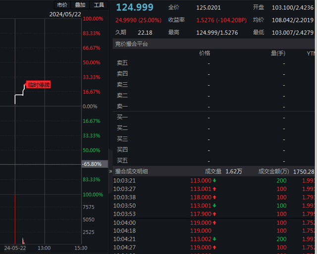行情數據顯示,“24特國01”在今日開市1分鐘漲幅便達到13.1%,觸發臨停。上午10點,“24特國01”恢復交易,隨後又迅速達到25%的漲幅,觸發第二次臨停。