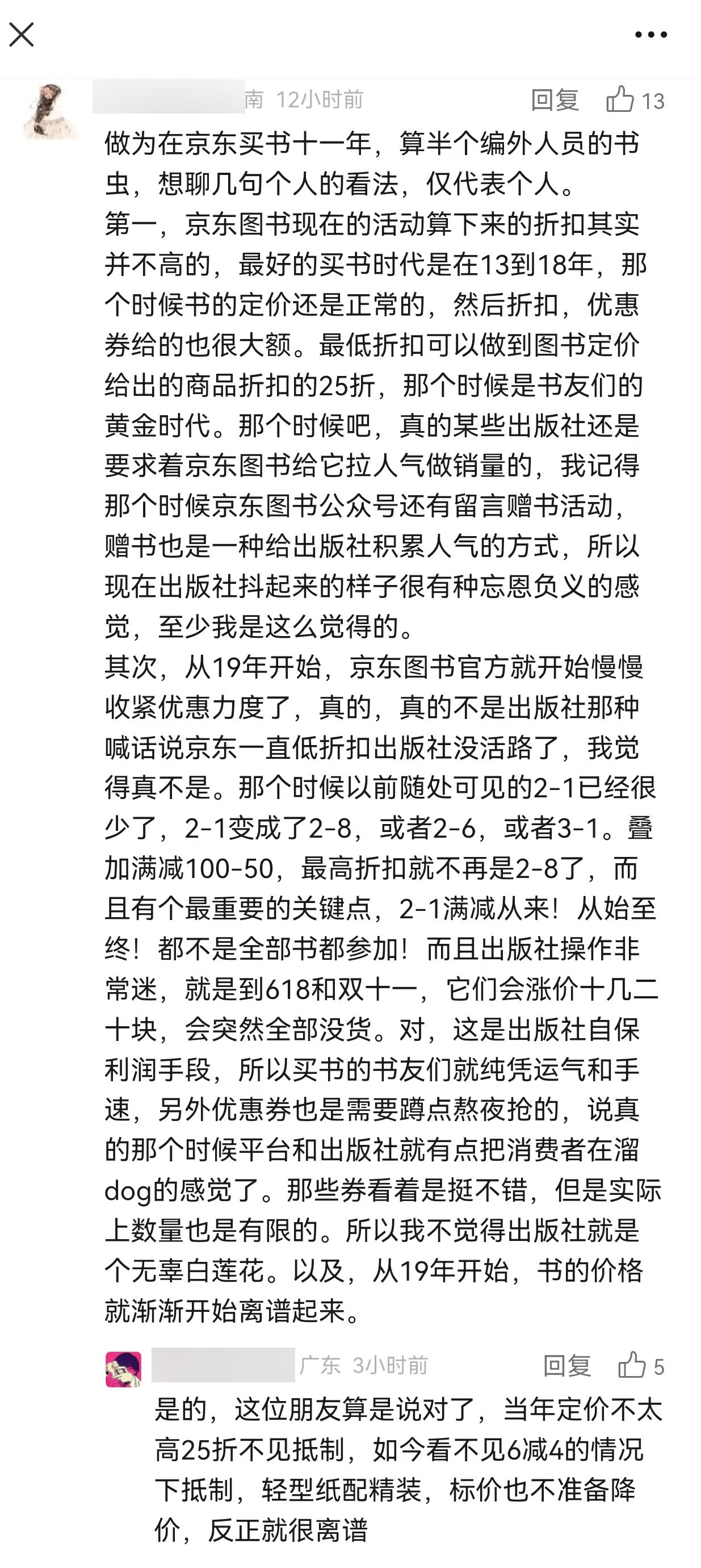 也有人認為,出版社並非是無辜的。據他測算,現在的折扣力度其實並不高,而且從2019年開始,京東就開始收縮了優惠力度,並非“京東一直低折扣,出版社沒活路了”——遑論出版社也不乏“突然漲價”、“全部沒貨”等自保手段——有網友補充道,現在一些出版社的“輕型紙配精裝”,同樣離譜。