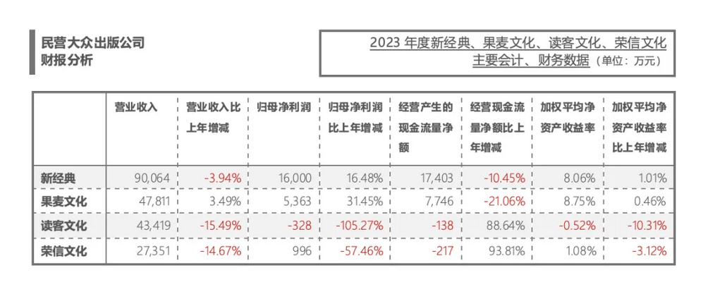 算上成本,有時已經不僅僅是賺得少了,而是虧錢了。出版行業已經來到了生死存亡的關頭。有人統計過:2023年,新經典等4家民營出版公司中,3家營收負增長,2家歸母淨利潤負增長,2家經營活動產生的現金流量淨額是負數。“出版商,已經被逼急了。”