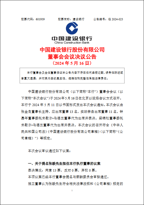 5月16日晚間,建行一連公告多條人事變動信息,涉及新任行長、副行長、董事會秘書與首席風險官。其中,張毅被聘任為建行新任行長,並被提名擔任該行執行董事、董事會相關專門委員會委員。副行長李建江任職資格獲監管核准,已正式就任該行副行長併兼任首席風險官。副行長王兵兼任該行董事會秘書。
