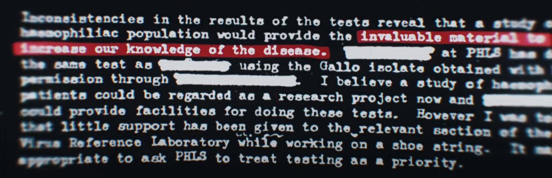 令人髮指的還不僅於此,在一份撰寫於1984年10月12日的血友病中心主任的會議紀要中有這樣的表述:“對血友病人羣的艾滋病研究將提供珍稀的資料,以增加對該疾病的瞭解……這是一個寶貴的項目……建議只對特別提出告知要求的患者提供檢測報告,其他的由血友病中心主任自行決定。”更有甚者,直接對患者隱瞞了對他們進行的測試是HIV測試。