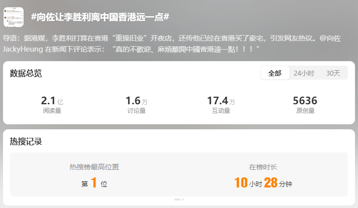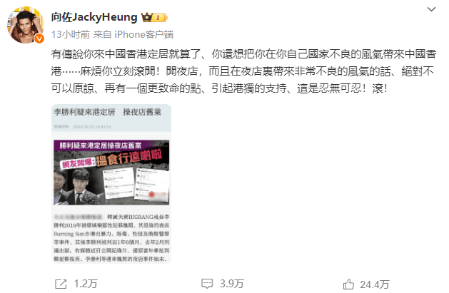 “李勝利來港定居”的消息迅速引發輿論爭議,香港藝人向佐在微博評論稱:“真的不歡迎,麻煩離開中國香港遠一點!”相關話題登上微博熱搜第一。