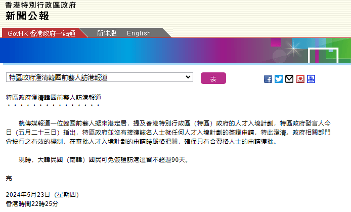 就傳媒報導一位韓國前藝人擬來港定居,提及香港特別行政區政府的人才入境計劃,特區政府發言人指出,特區政府並沒有接獲該名人士就任何人才入境計劃的簽證申請,特此澄清。政府相關部門會按行之有效的機制,在審批人才入境計劃的申請時嚴格把關,確保只有合資格人士的申請獲批。