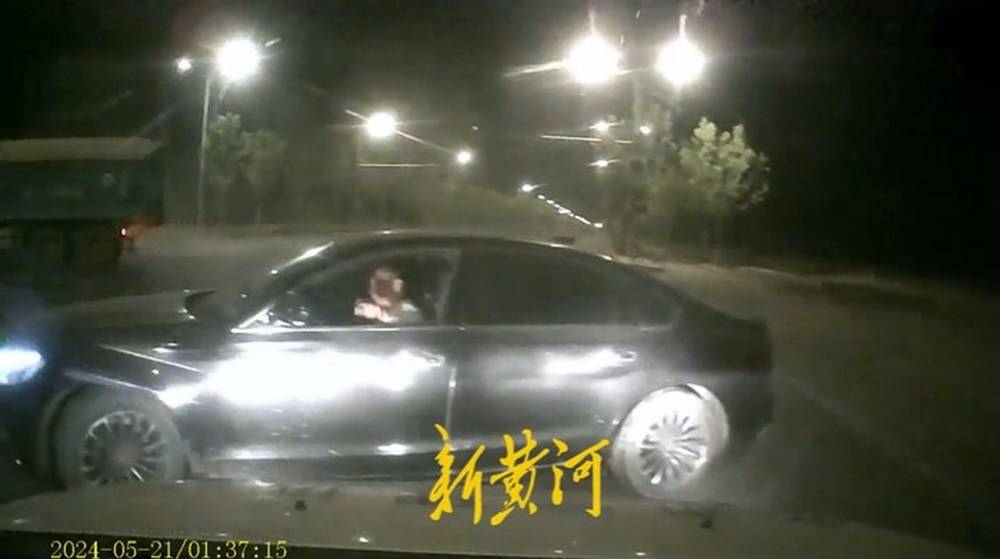 記者在第一段時長為3分鐘的行車記錄儀視頻上看到,時間是5月21日1:36,巡查車輛與渣土車對向行駛,渣土車倒車至主路口時,一輛黑色眾泰牌私家車擋在了巡邏車前方,此時,渣土車調頭快速離去。