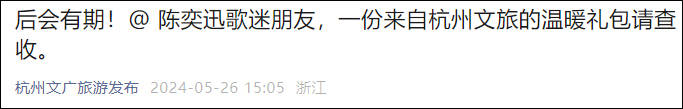 隨後,“杭州文廣旅遊發佈”發佈消息稱,演唱會雖然擇期舉辦,但幸福不延期。意外也是生活的一部分,每一次等待都是為了更美麗的相遇。