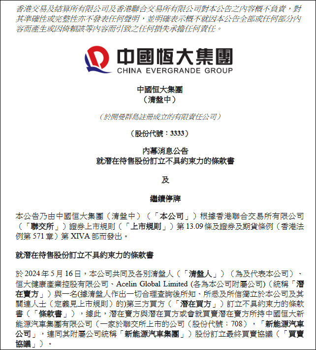 中國恒大:就所持恒大汽車股份與潛在買方訂立不具約束力條款書,股票繼續停牌