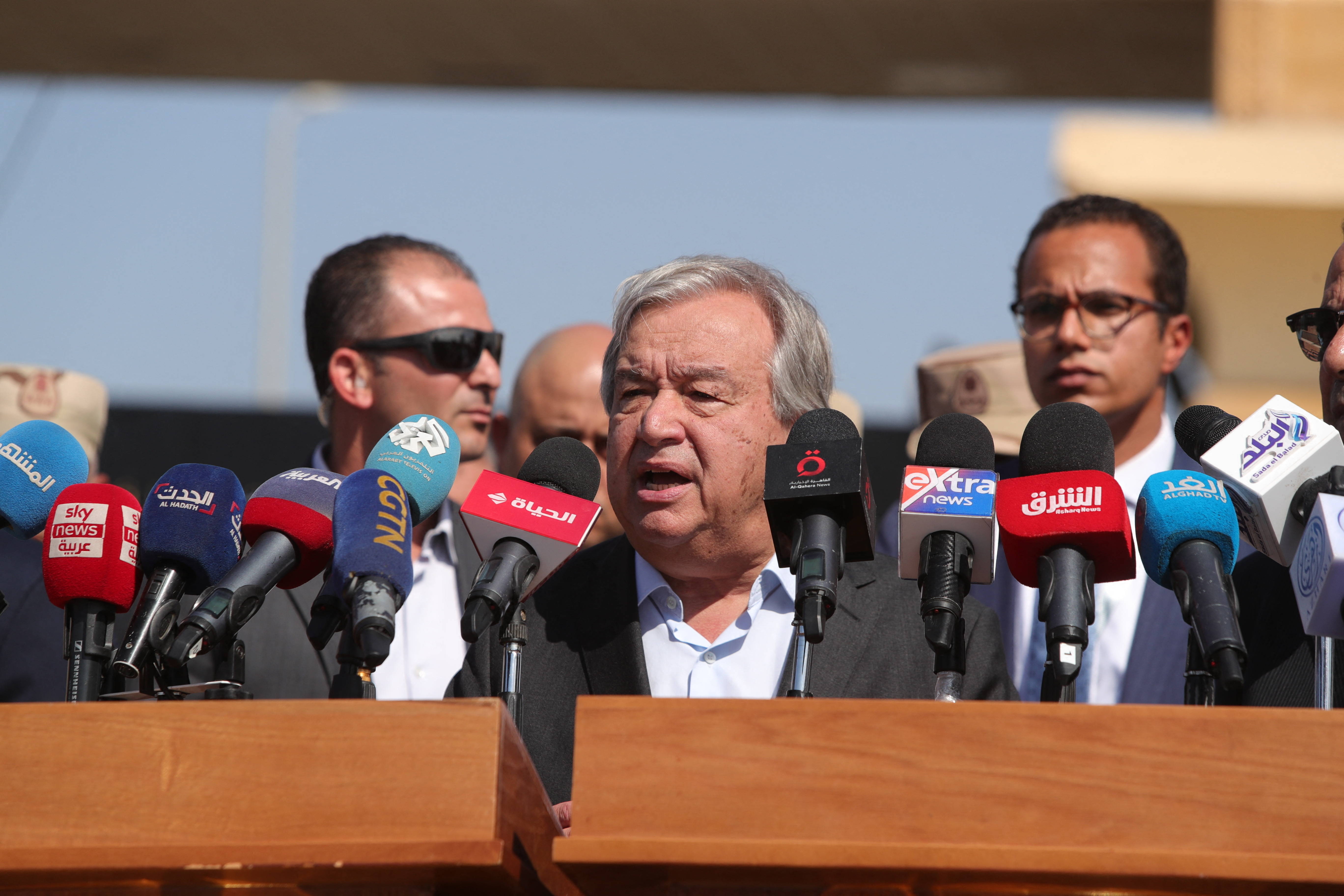 2023年10月20日,聯合國秘書長古特雷斯在拉法口岸埃及一側舉行新聞發佈會呼籲放行援助車隊。 圖自IC photo