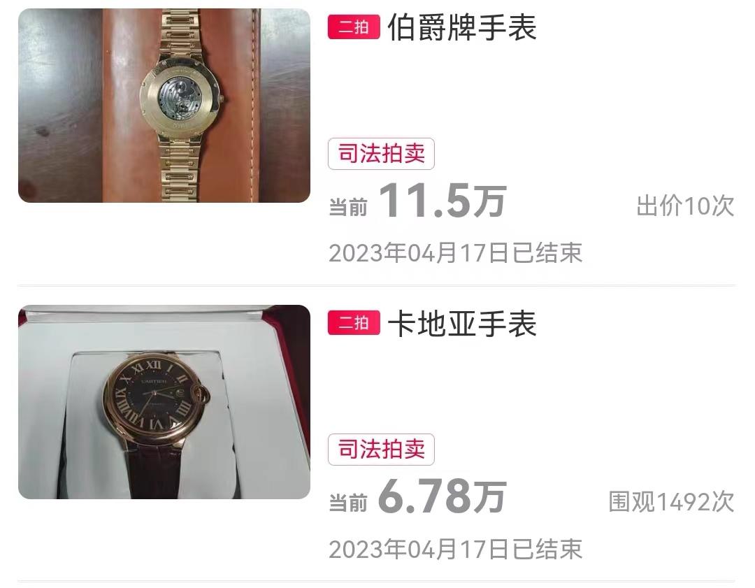 張標受賄所得還包括兩塊名錶,其中評估價為11.64萬元的伯爵牌手錶於2023年4月17日在二拍中由劉某某競得,成交價11.508萬元。另一塊評估價為7.14萬元的卡地亞手錶於當日流拍,尚未進入變賣程序。