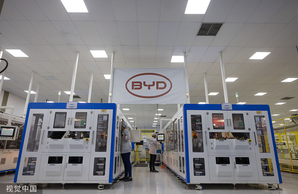當地時間2023年11月14日,巴西聖保羅州,比亞迪太陽能電池板和電動巴士底盤生產工廠的工人。(視覺中國)