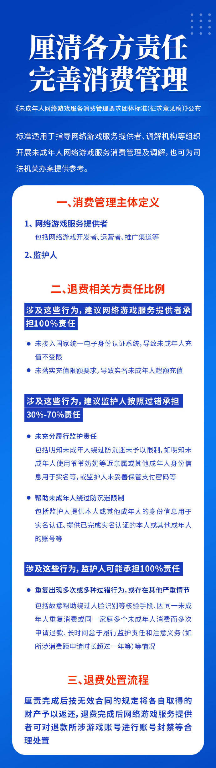 針對廣受關注的未成年人遊戲退費問題,該標準明確:網絡遊戲服務提供者、監護人等過錯方應當根據各自過錯情況分別承擔相應的責任,有過錯的一方應當賠償對方由此所受到的經濟損失,各方都有過錯的,監護人、網絡遊戲服務提供者應承擔各自責任。