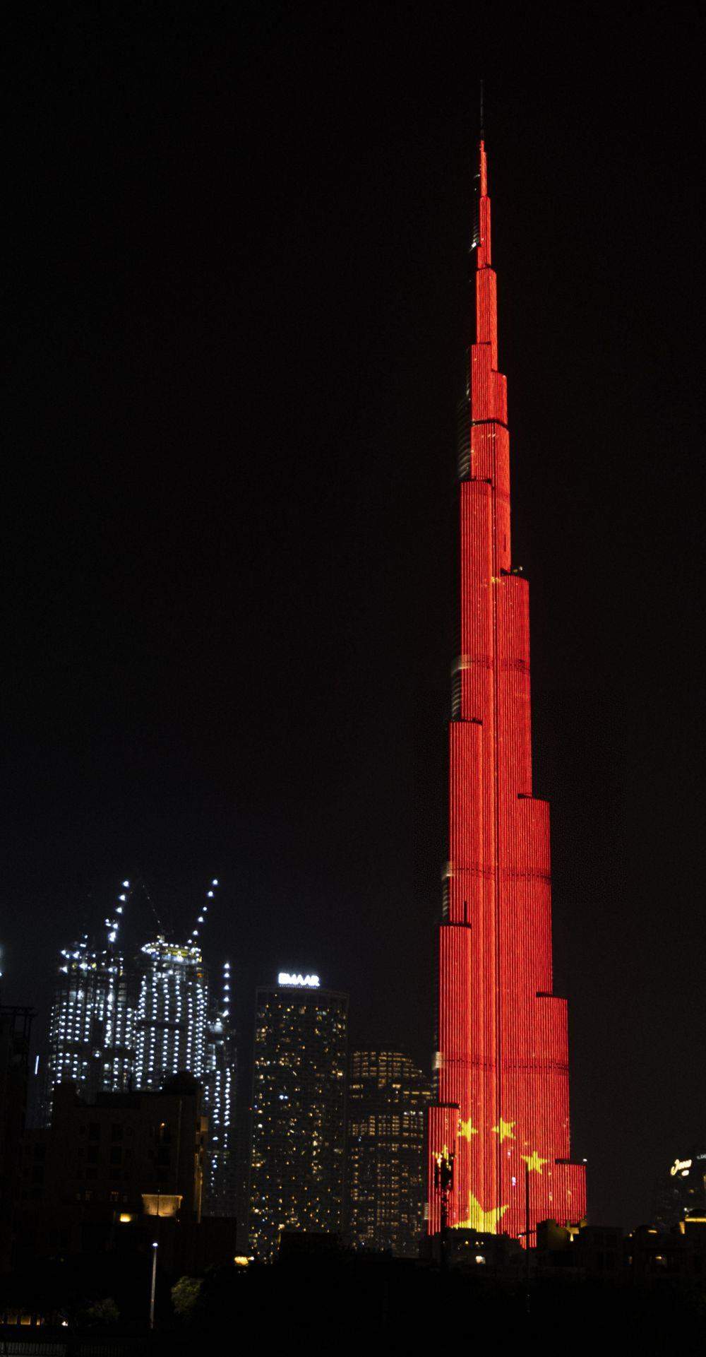 △當地時間2020年2月2日,在阿聯酋迪拜,當地地標建築物哈利法塔點亮中國國旗圖案,為中國抗擊新冠肺炎疫情加油。