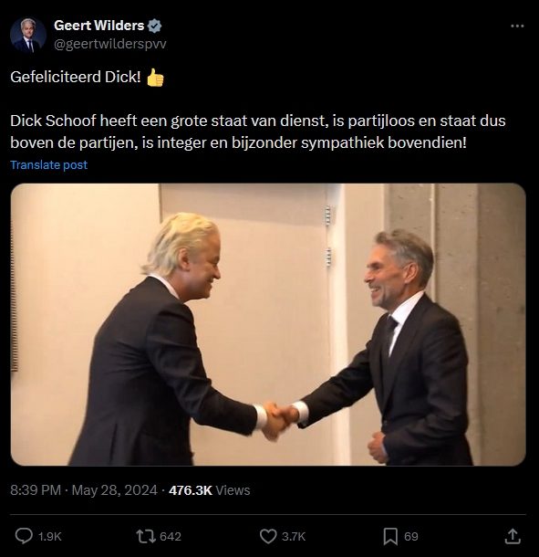 維爾德斯28日在社交媒體上對肖夫表示祝賀。“祝賀你,迪克。迪克·肖夫有很好的紀錄,他不是任何政黨的成員,因此站在政黨之上,他為人正直,而且非常友好(觀察者網注:路透社根據荷蘭文譯為friendly,也有媒體譯作討人喜歡,likeable)!”