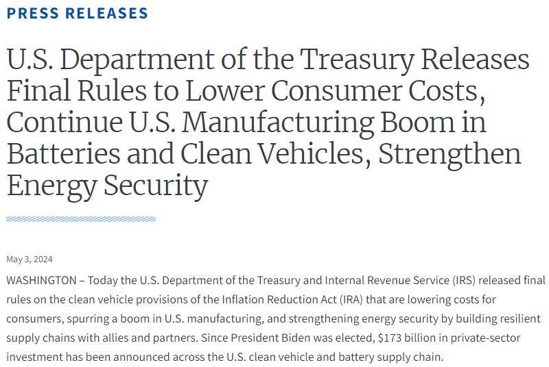 美國財政部5月3日公佈電動汽車補貼細則網站截圖