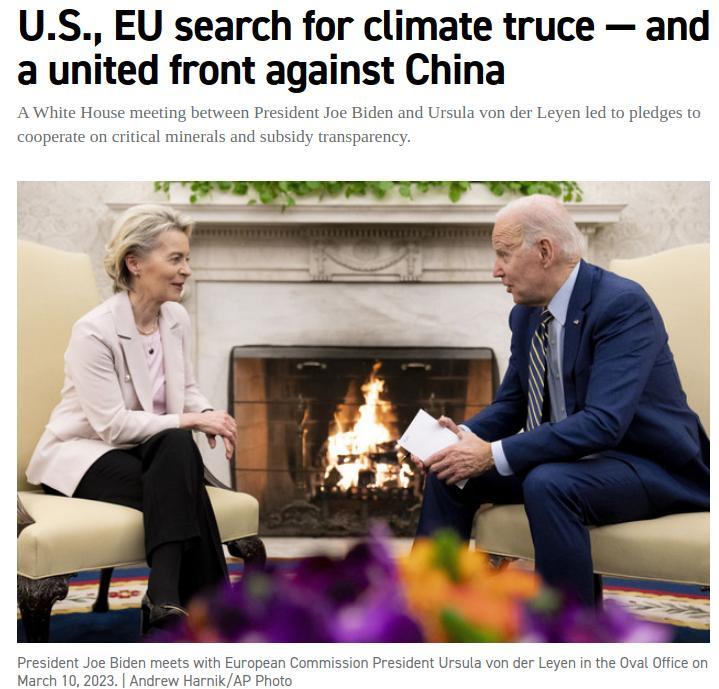 2023年3月拜登在白宮與歐盟主席馮德萊恩商討電動汽車補貼問題