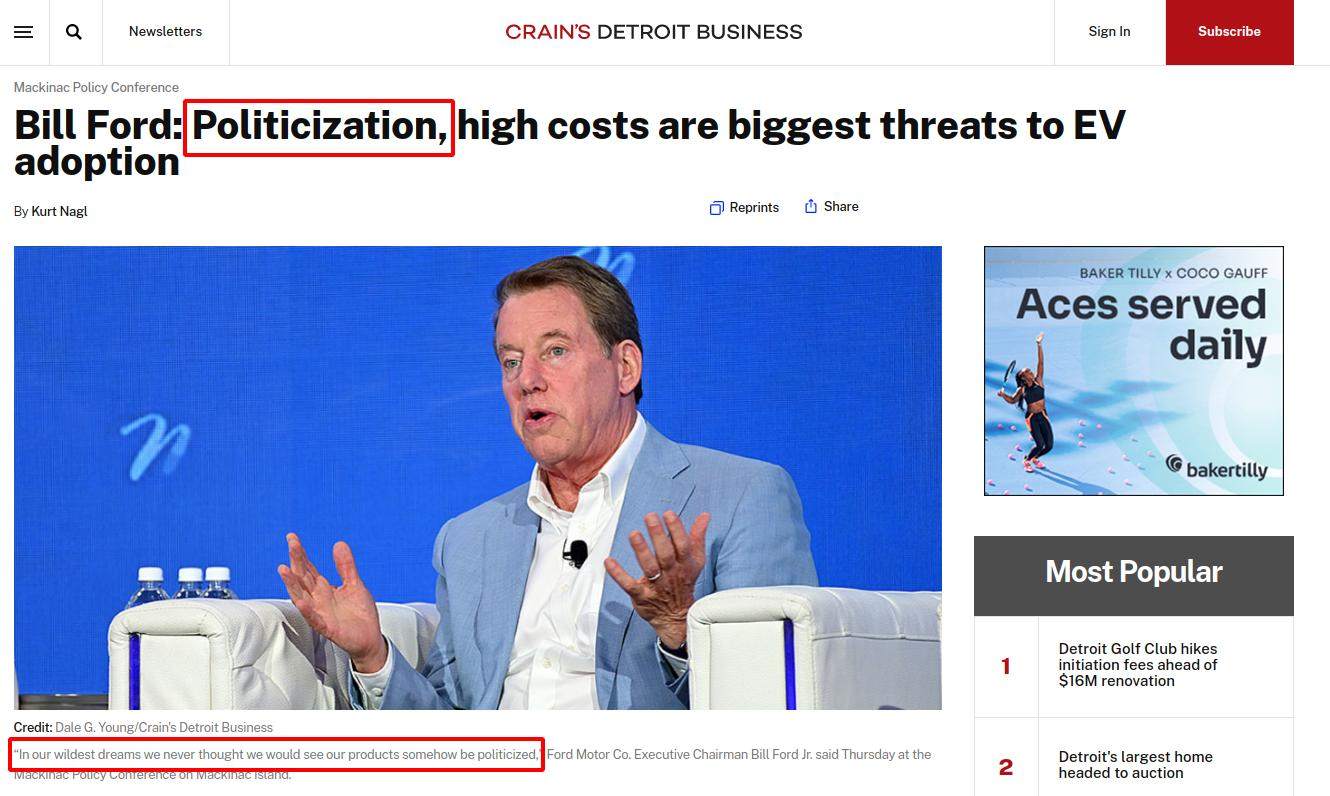 去年6月1日,比爾·福特在一次採訪中還這樣評論過,“我對世界汽車行業電動化進展之快感到吃驚,但對美國,特別是福特的產品已經變得如此政治極化感到更吃驚。”他進一步解釋道,“現在有一種觀念,如果你政治上是“紅的”(指支持共和黨),那就支持燃油車,如果你是“藍的”(指支持民主黨),那就支持電動汽車。即使最瘋狂的夢,我們也沒有想到我們的汽車產品竟這樣政治化了!”