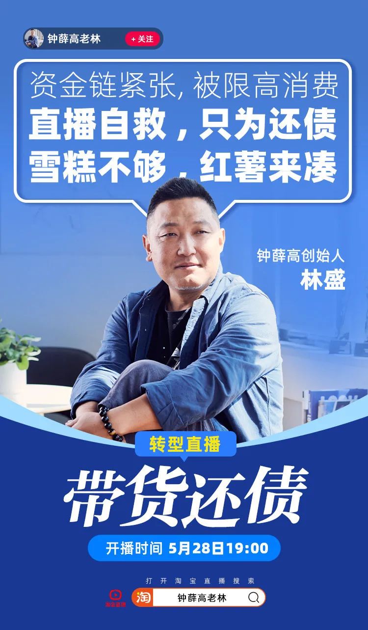 5月27日,鍾薛高創始人林盛開設淘寶直播賬號,將通過直播帶貨的形式還債。5月28日晚,林盛正式開播。開播前他表示目前拖欠729位員工薪資,直播賺錢後將逐步還錢給員工,背景板寫着“鍾薛高老林直播賣紅薯”與數字“729”。