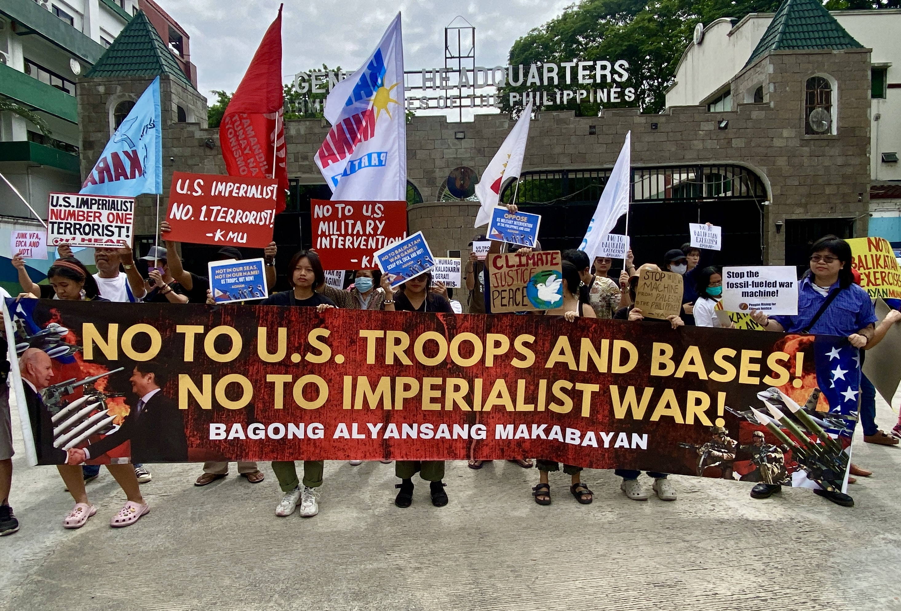 2024年4月22日,菲律賓奎松市,民眾在武裝部隊總部外集會示威,譴責菲美“肩並肩”聯合軍演。(澎湃影像)