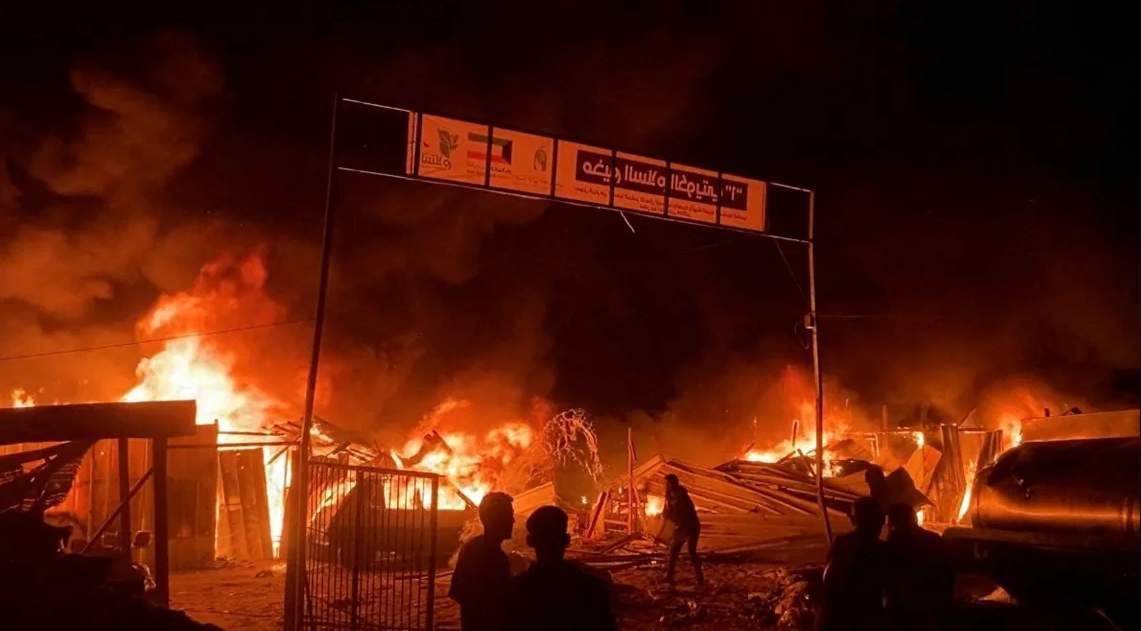 當地時間2024年5月26日晚,以色列襲擊拉法難民營後,大火肆虐。(路透社)