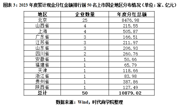 從地區分佈情況來看,如圖表3所示,2023年度累計現金分紅金額排名前50的上市國企中,北京地區佔據半數,總計25家;山西省、上海市各4家,廣東省、江蘇省、山東省各3家;四川省2家;安徽省、福建省、天津、浙江省、貴州省、陝西省各1家。