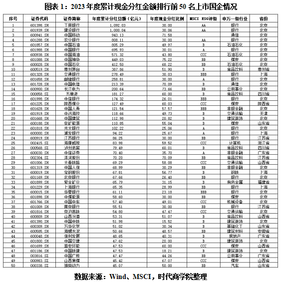 如圖表1所示,時代商學院梳理了2023年上市國企中年度累計現金分紅金額排行前50名企業,從而為A股市場樹立優質上市國企高質量發展風向標。