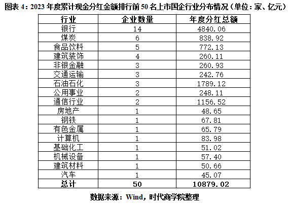 此外,從行業分佈情況來看,如圖表4所示,2023年度累計現金分紅金額排名前50的上市國企中,數量最多的為上市銀行(申萬一級,下同),共14家,佔比達28%。