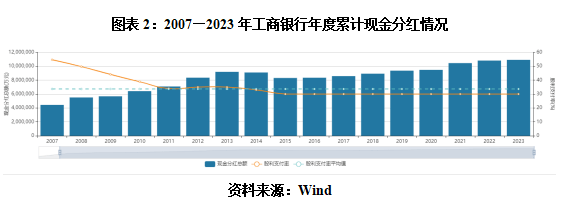 如圖表2所示,2021—2023年,工商銀行的年度累計現金分紅金額分別為1045.34億元、1081.69億元、1092.03億元,連續三年超千億元,呈連續增長態勢。2007—2023年,工商銀行連續17年穩居A股上市國企“分紅王”寶座。