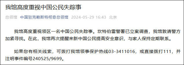 據微信公眾號“中國駐克賴斯特徹奇總領館”5月29日消息,我館高度重視領區一名中國公民失蹤事。坎特伯雷警署已立案調查,我館敦請警方加緊尋找。在此,我館再次提醒來新中國公民提高安全意識,與家人保持定期聯繫。