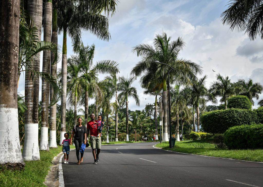 5月19日,在赤道幾內亞首都馬拉博,當地居民在中國企業承建的馬拉博國家公園裏散步。