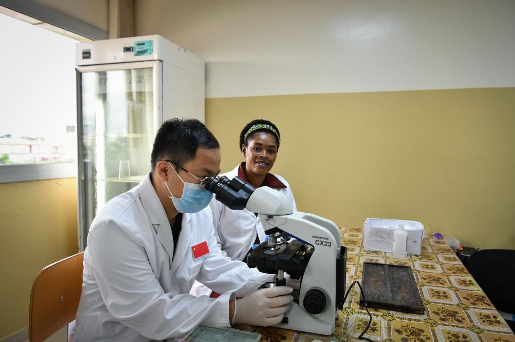 5月16日,在赤道幾內亞馬拉博地區醫院,中國醫生同當地同事一起檢測樣本。
