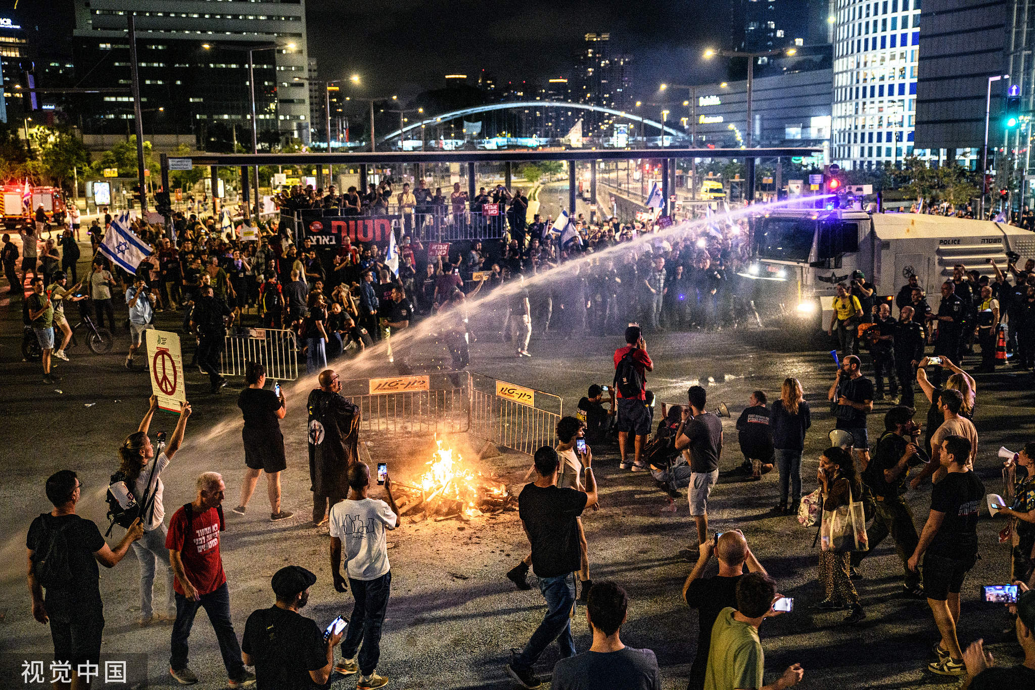當地時間5月25日,特拉維夫,以色列警察用高壓水槍驅散抗議者(視覺中國)