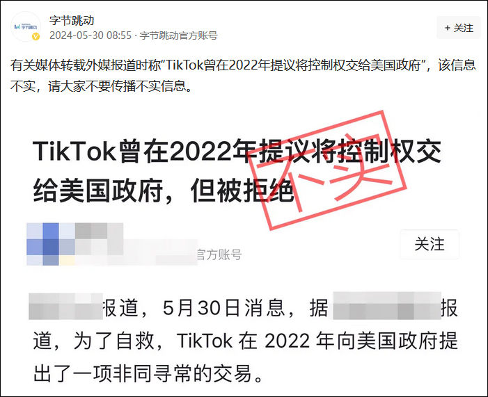 TikTok曾在2022年提議將控制權交給美國政府?字節跳動:消息不實 guancha 2024-05-30 5月30日,字節跳動發文稱,有關媒體轉載外媒報道時稱“TikTok曾在2022年提議將控制權交給美國政府”,該信息不實,請大家不要傳播不實信息。