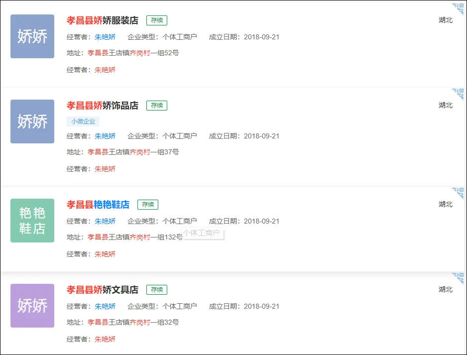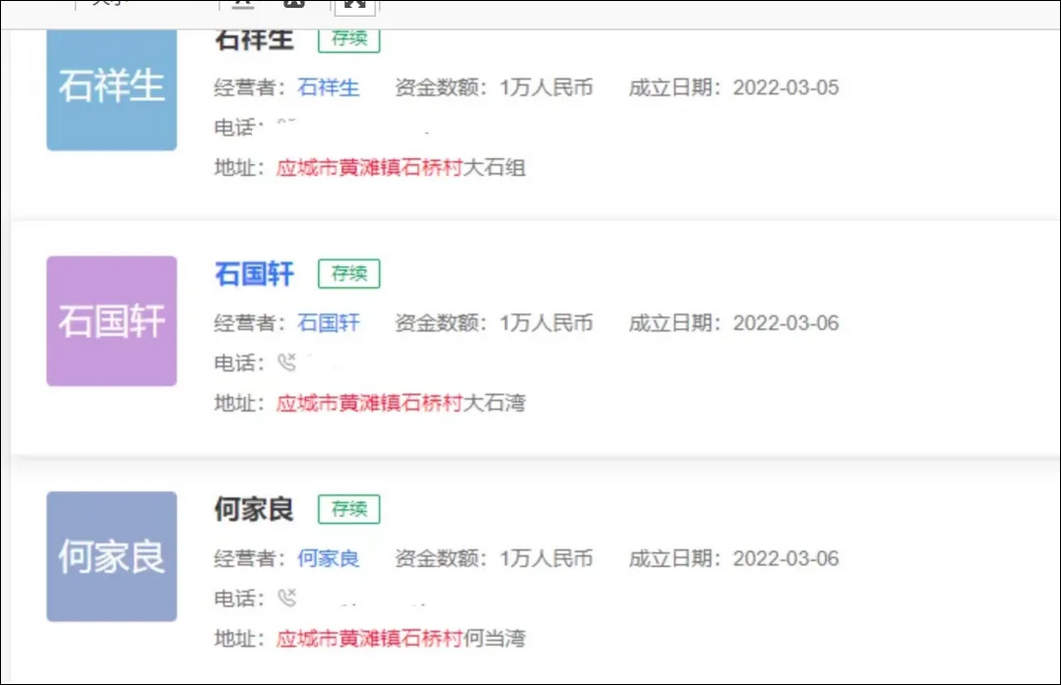 應城市距離大悟縣100多公里,屬孝感市代管縣級市,下轄5個街道辦事處和10個鎮,黃灘鎮是其中之一。天眼查顯示,黃灘鎮石橋村在2018年11月3日註冊了19個個體工商户營業執照,經營範圍涵蓋“餐飲”“室內裝修”“製造”“百貨零售”等多種行業。