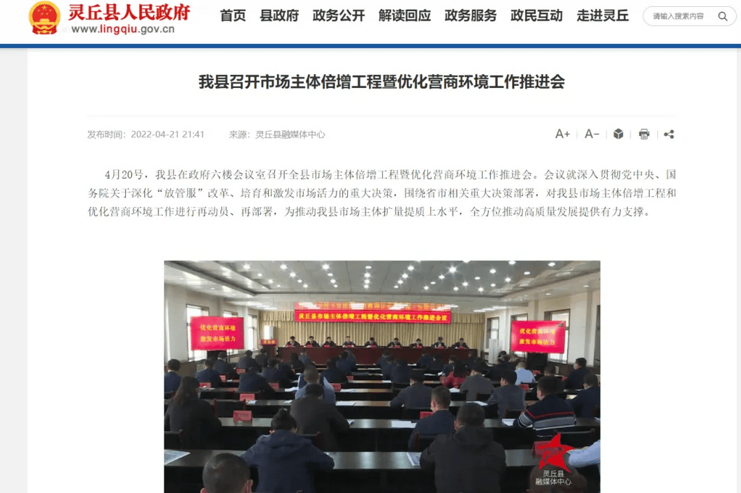 2022年4月20日,靈丘縣召開市場主體倍增工程暨優化營商環境工作推進會(靈丘縣政府官網 央廣網發)
