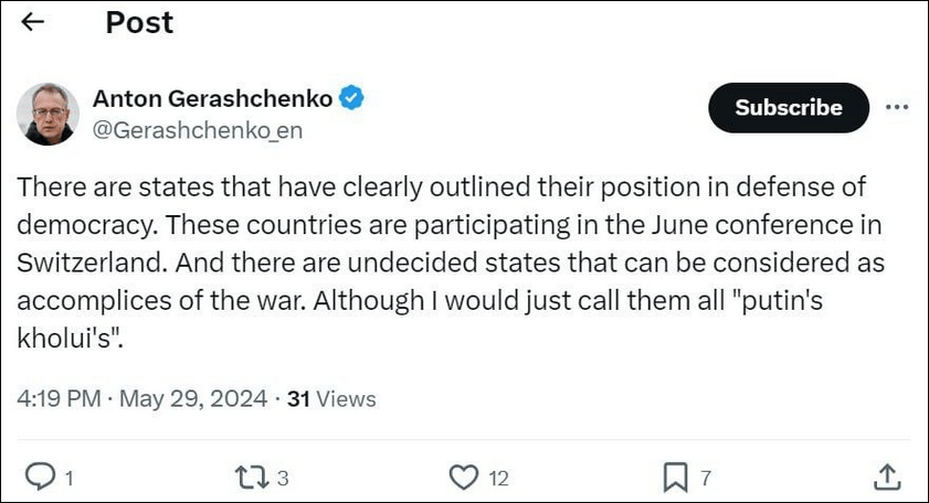 對此,烏克蘭知名政客安東·格拉先科(Anton Gerashchenko)當地時間5月30日言辭激烈地發文抨擊稱,那些猶豫不決而不參加此次烏克蘭和平峯會的人,都是“俄羅斯總統普京的走狗”,明顯是在向美方領導人發難。然而,他隨後又很快刪除了帖文。