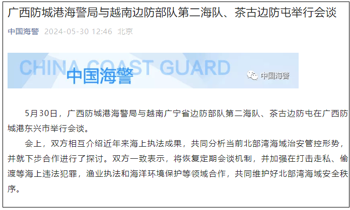 微信公眾號“中國海警”消息,5月30日,廣西防城港海警局與越南廣寧省邊防部隊第二海隊、茶古邊防屯在廣西防城港東興市舉行會談。