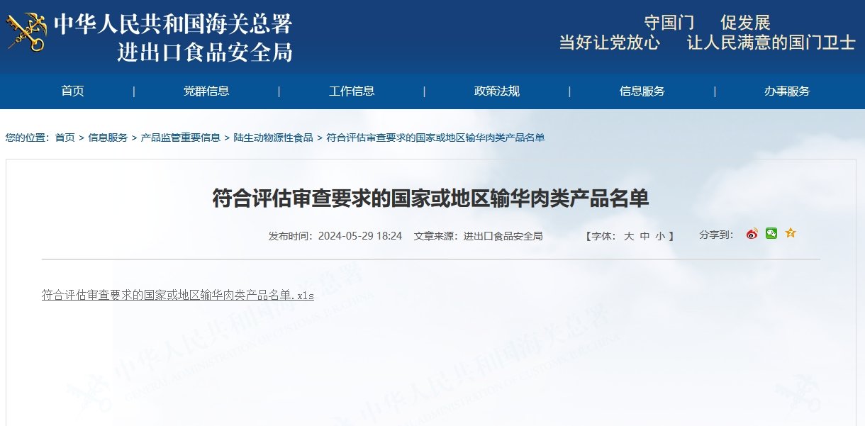 觀察者網30日查詢發現,中國海關總署進出口食品安全局29日晚在網站上更新了《符合評估審查要求的國家或地區輸華肉類產品名單》,上述五家肉類加工廠編號已被添加到名單內。