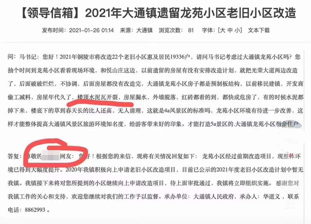 吳先生在留言中代表當時尚未進行老舊小區改造的住户表示:2021年銅陵市老舊小區改造項目並未將龍苑小區列入其中。龍苑小區房子都是預製板結構,開發商偷工減料,房屋年代久了,樓頂水泥瓦開裂,房屋漏水,外牆脱落,紅磚都看得到,都快成危房了,有的時候水泥都掉下來……樓底下的草到春天長得比人還高,無人清理……