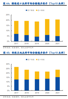 研報認為,國內貓糧品牌在維生素含量上和國外高端品牌差距較大,國內狗糧品牌在蛋白質含量上遠遜於國外品牌。但是:寵物貓餵養的精細化要求高,品質過硬的高端進口品牌更受歡迎,進口品牌份額保持提升;相反,寵物狗的餵養要求往往低於寵物貓,本土品牌可以憑藉價格優勢攻下國外品牌份額。