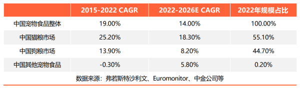 據弗若斯特沙利文數據,2022年中國寵物食品、寵物用品和寵物醫療及服務市場三大賽道,其規模分別為1136億元、416億元和1062億元;2015-2022年,三者CAGR分別為19.0%、15.6%和17.7%。寵物食品在規模和增速上,表現最亮眼。