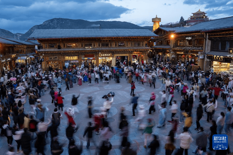 5月3日,在雲南迪慶藏族自治州香格里拉市,遊客與當地羣眾在獨克宗古城四方街廣場跳鍋莊。(新華社 馬宏波 攝)