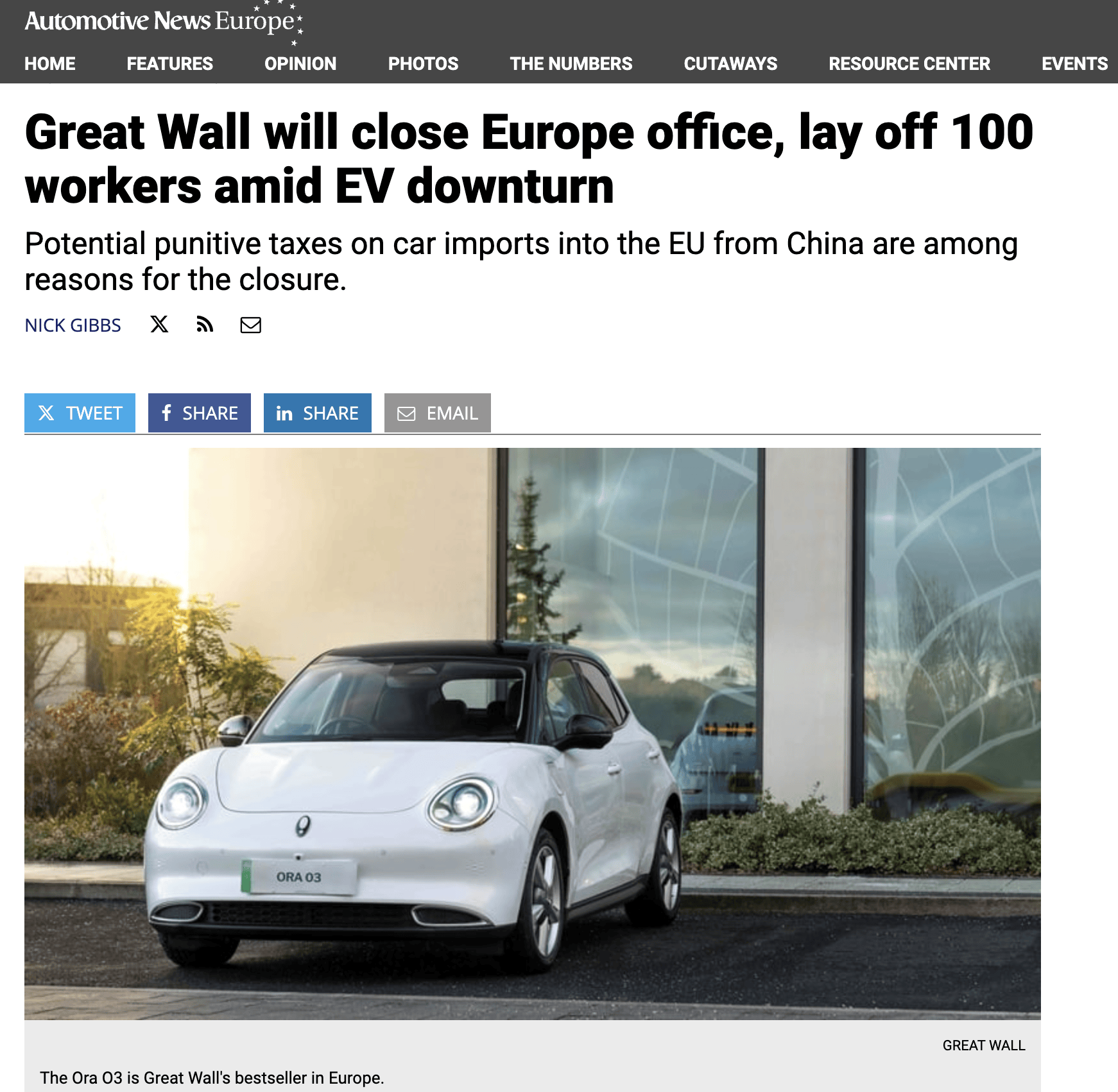 長城汽車歐洲發言人對《歐洲汽車新聞》表示:“此舉更多是針對艱難的市場環境進行的組織和優化調整。歐洲電動汽車市場(尤其是德國市場)的增速放緩、競爭對手紛紛提供大幅折扣、歐盟對中國電動汽車展開反補貼調查後可能會徵收懲罰性關税,這些都給像我們這樣擁有電動汽車投資組合的公司帶來非常高的不確定性。”