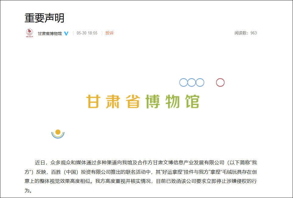 5月30日晚,微博@甘肅省博物館 針對此事發布聲明回應稱,目前已致函百勝(中國)投資有限公司要求立即停止涉嫌侵權的行為。