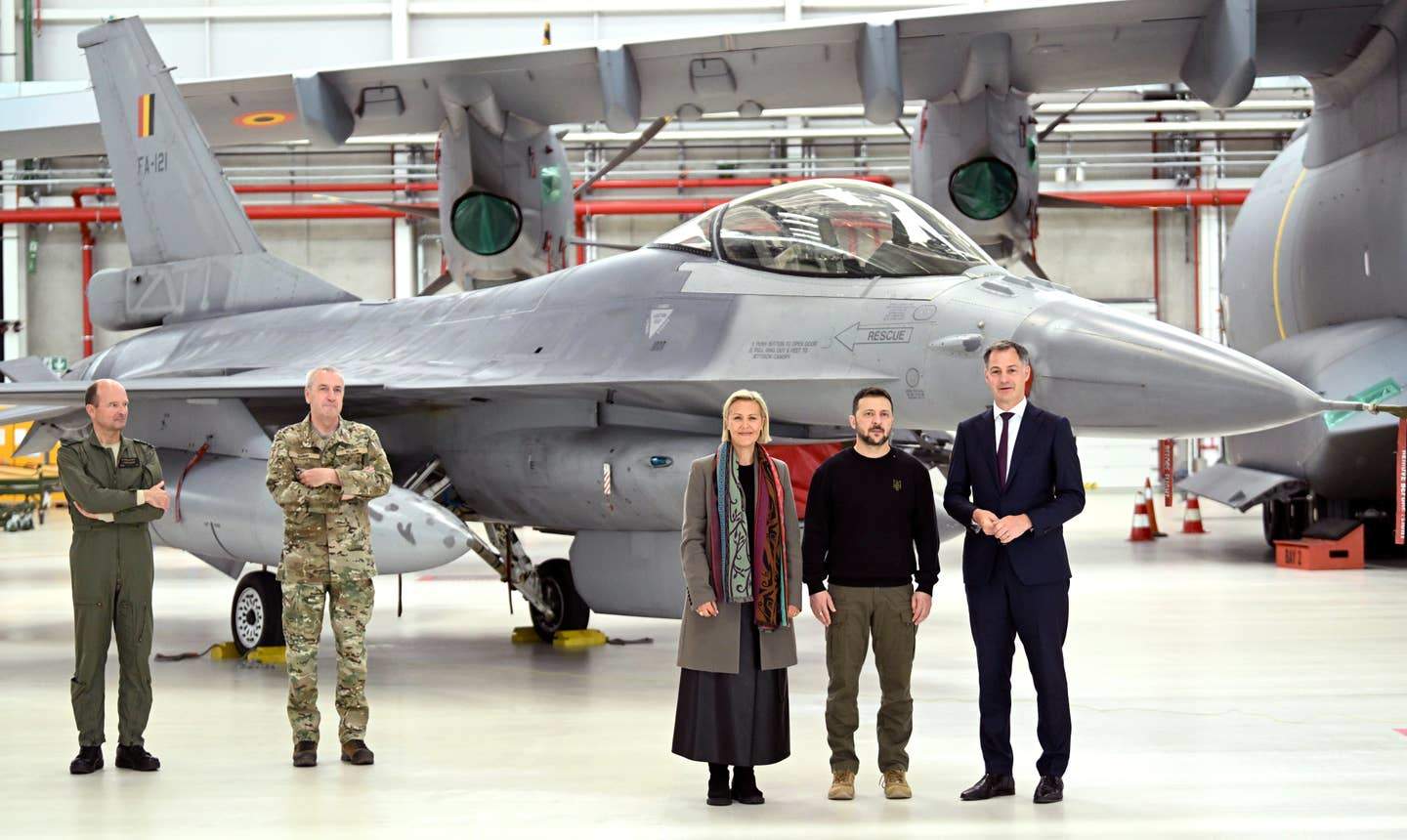 據報道稱,比利時援助烏克蘭的30架F-16將在今年底前開始交付,圖為烏克蘭總統澤連斯基在訪問比利時期間與F-16戰機合影
